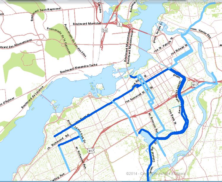 If Council accepts recommendations in the updated Ottawa Cycling Plan (2013), the city will begin clearing an additional 19km of cycling routes, bringing the winter cycling network to total of 40km. You can view the map of the existing and proposed winter cycling network on the city’s web-based mapping application, GeoOttawa (Click on ‘More layers’, tick off ‘Cycling’ ->tick off ‘cycling plan’ -> tick off ‘Winter network’ and you’ll get this: