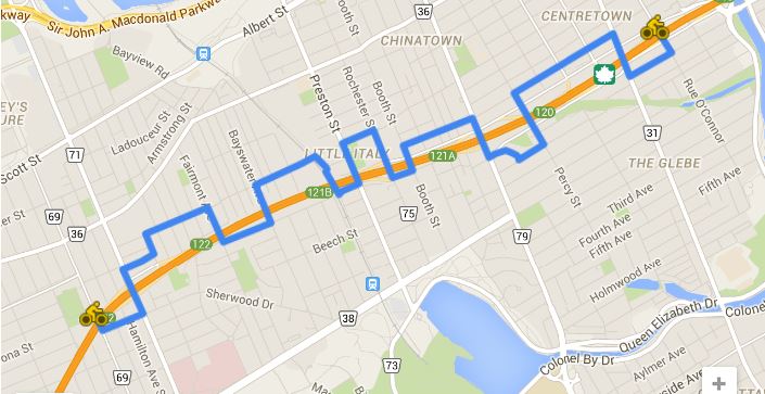Recommended narrowing of the O-Train bridge is a focal point for cyclists: while the proposal leaves room for the existing multi-use pathway, it would make it impossible to build a second path on the west side of the tracks. A pathway on the western side of the tracks has been suggested in nearby community plans. CfSC will bring this disconnect between city planning and MTO recommendations to the the consultants’ and the city’s attention at this early stage, and will continue to monitor the mid-town Queensway bridge project.