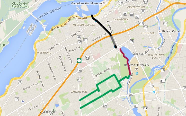 Black is existing paved route, gray is stonedust route, red is existing Arboretum Multi Use Pathway, green is Experimental Farm roads/paths.