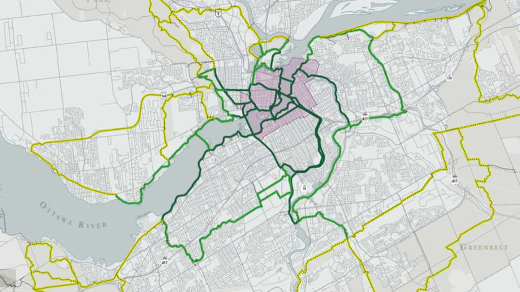 The fully-built network includes new segments of pathway and upgraded segments in order to provide a continuous loop around the periphery of the capital region. In particular, this would create additional routes through the Greenbelt which would provide safe access to NCC amenities like the Mer Bleue trail and Bruce Pit, and provide alternate routes to Bells Corners and Blackburn Hamlet. In the core area, the Ottawa River Pathway will eventually be linked between the Parliament locks and Rideau Hall, including a potential accessible crossing of the locks themselves.