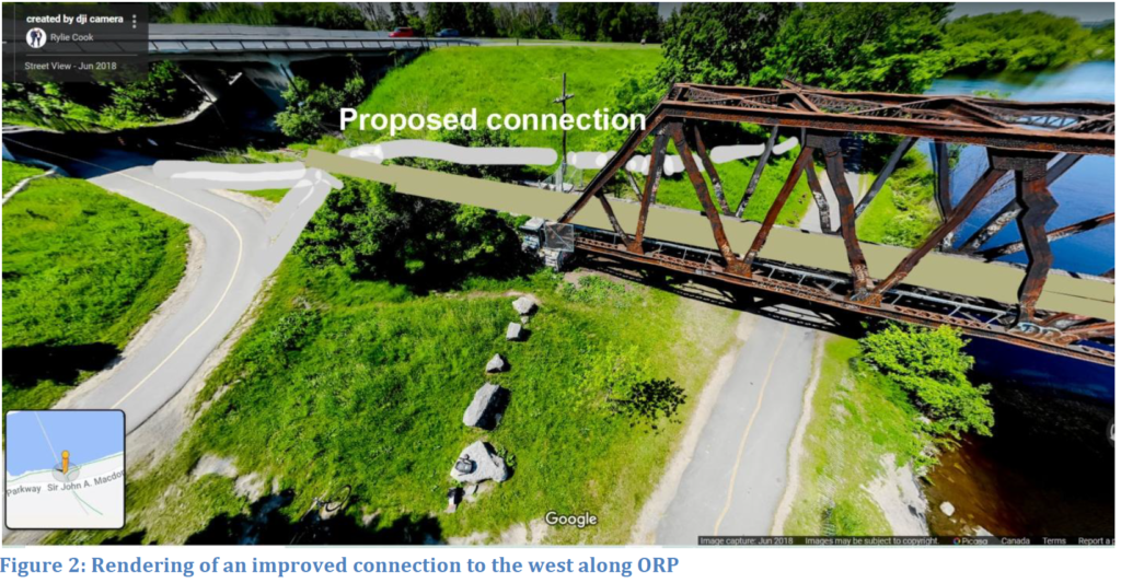 6. A new transition path should be built between the MUP at the south end of the bridge and the Ottawa River Pathway (ORP), to the west of the bridge. It is shown in accompanying figures. The purpose is to improve the connection between the north-south paths and those users originating from and destined to the west–a natural desire line for all modes and not just cyclists. This eliminates the need for cyclists to make a sharp turn at the terminus of the Trillium Pathway. That segment of Trillium should remain to serve the ORP to the east.