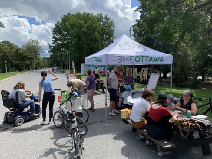 A child on a bike with training wheels rides with his mom on Beechwood Avenue in Ottawa, December 2024. He is learning to have an active lifestyle, helping to protect the environment, and more likely to become a lifelong cyclist because he is safe.